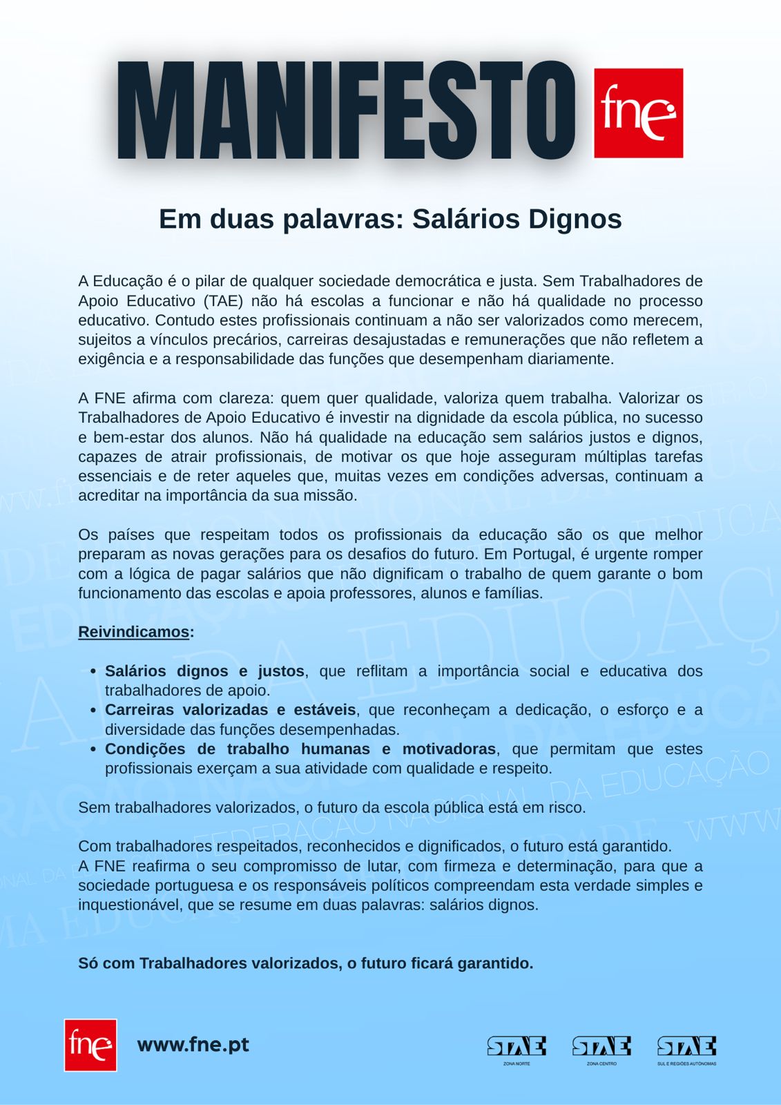 Quanto aos Trabalhadores de Apoio Educativo (TAE)/Não Docentes, a FNE defende igualmente um reforço claro do compromisso político e a implementação de medidas concretas que traduzam a sua verdadeira valorização.