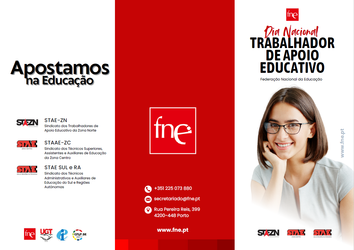 A Federação Nacional da Educação (FNE) a par dos seus três sindicatos (STAE Zona Norte, STAAE Zona Centro e STAAE Sul e Regiões Autónomas) de Trabalhadores de Apoio Educativo/Não Docentes (Assistentes Operacionais, Assistentes Técnicos e Técnicos Superiores) celebra hoje o Dia Nacional do Trabalhador de Apoio Educativo/Não Docentes.